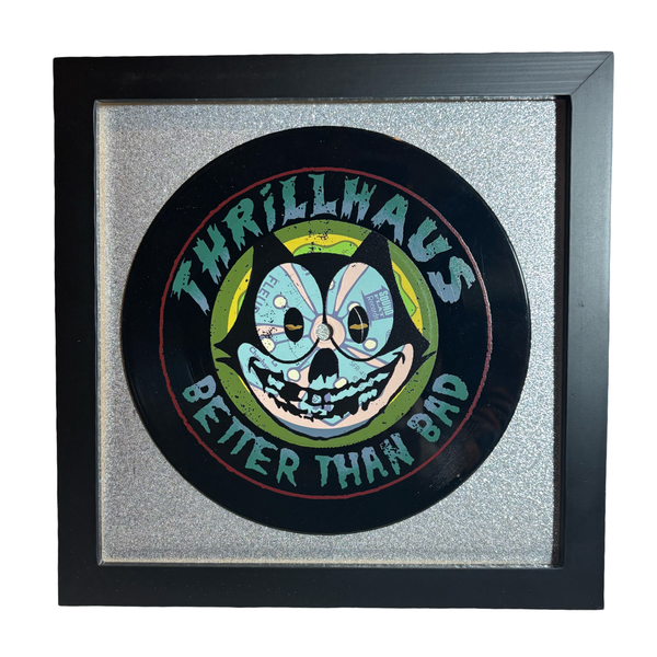 UV print on an actual 7” vinyl record. Framed with a glitter background